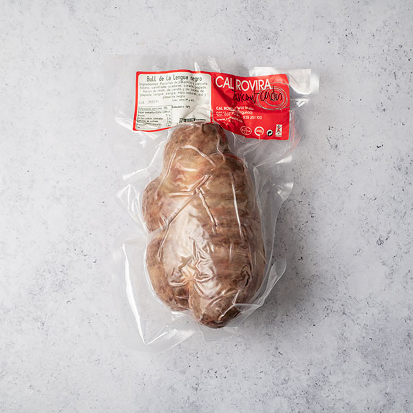 El bull negro con lengua es un embutido tradicional de Barcelona, elaborado con carne de cerdo, hígado, riñones, sangre y lengua, lo que le aporta un sabor intenso y una textura rica en matices. Se trata de un producto ya cocinado, por lo que resulta práctico y fácil de disfrutar en cualquier momento.